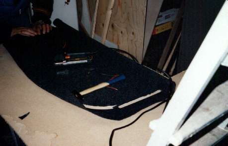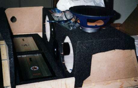 Nu paste de poorten er wel in en moest de kist aan de binnenkant bekleed worden, want dan isoleert de kist beter en bij de lokale audiozaak zeiden ze dat ik afzuigkapwol kon gebruiken, dus heb ik deze erin geniet. Intussen had ik al bedacht om de versterkers in de planken gaan te bouwen en af te werken met zwarte biezen, maar ik moest nog wel bij de achterlichten kunnen dus moesten de zijplanken gaan schanieren, dit werd gedaan met behulp van pianoscharnieren. Terwijl ik rond aan het lopen was bij de hobbyzaak zag ik ineens een setje halogeen lampen liggen en voelde me toch genoodzaakt om een setje te kopen, want mijn originele kofferbak lamp die zag je niet meer.