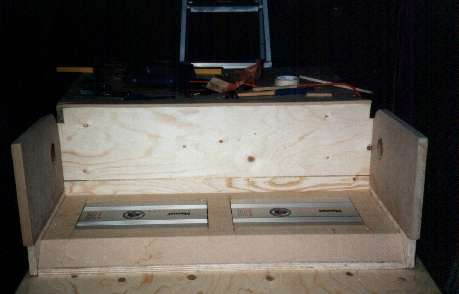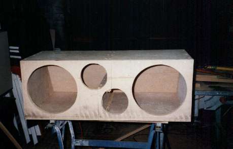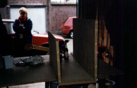 Na het in elkaar zetten van de kist (die circa 35 kg woog) kregen we het volgende probleem, de reflexpoorten pasten er niet goed in, er was domweg geen ruimte om te flenzen ervan te installeren, maar uiteindelijk naar een dag piekeren kwamen we er toch uit om de tussenschot te veranderen met een soort trapvorm, dan paste de poorten er wel in.