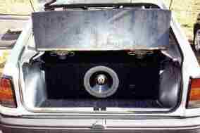 de volgende dag zag ik bij toeval een pioneer subwoofer en een versterker voor een prikkie liggen en kocht deze alsmede een jvc radio cd-speler en liet ook dezelfde dag nog een kist bouwen voor de woofer. Een week daarna installeerde ik alles in de auto en werd die hoedenplank vervangen door een 22mm multiplexplaat waar mijn jbl titaniums in kwamen te hangen.